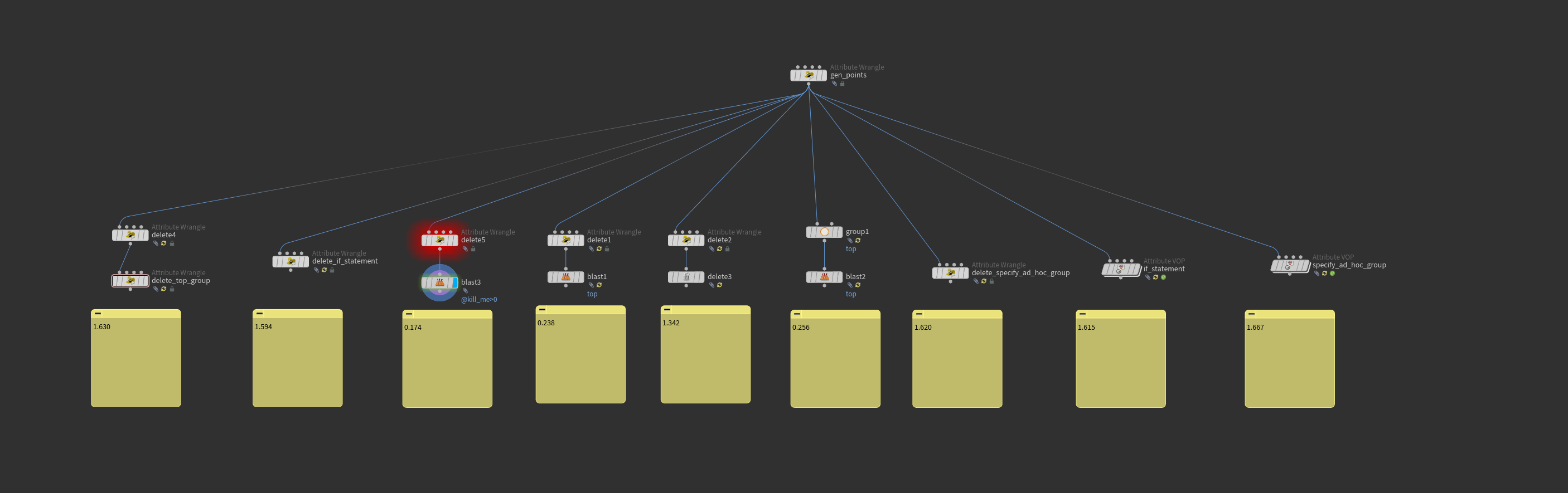 someone said , group + blast is much faster than an if statement + “removepoint()“ so I ran some tests (20 million points) and it is indeed true, although the absolute fastest is grouping using an integer attribute instead then doing “ @my_attrib>0“ in the blast (0.174 seconds compared to 1.594 for “if + removepoint()“, maybe this is helpful to someone 😄