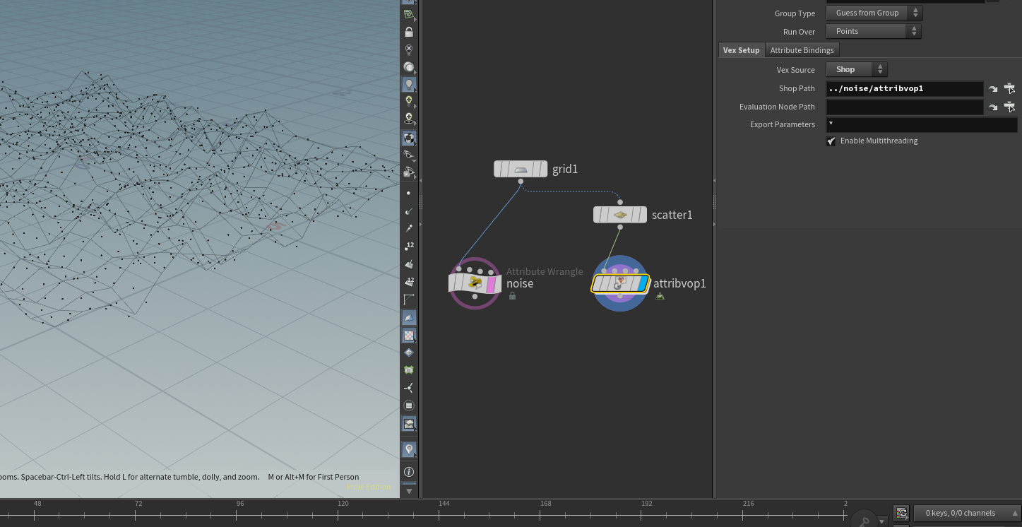 here I’m calling the vex source from the `noise` wrangle – and it’ll run that vex snippet on the vop