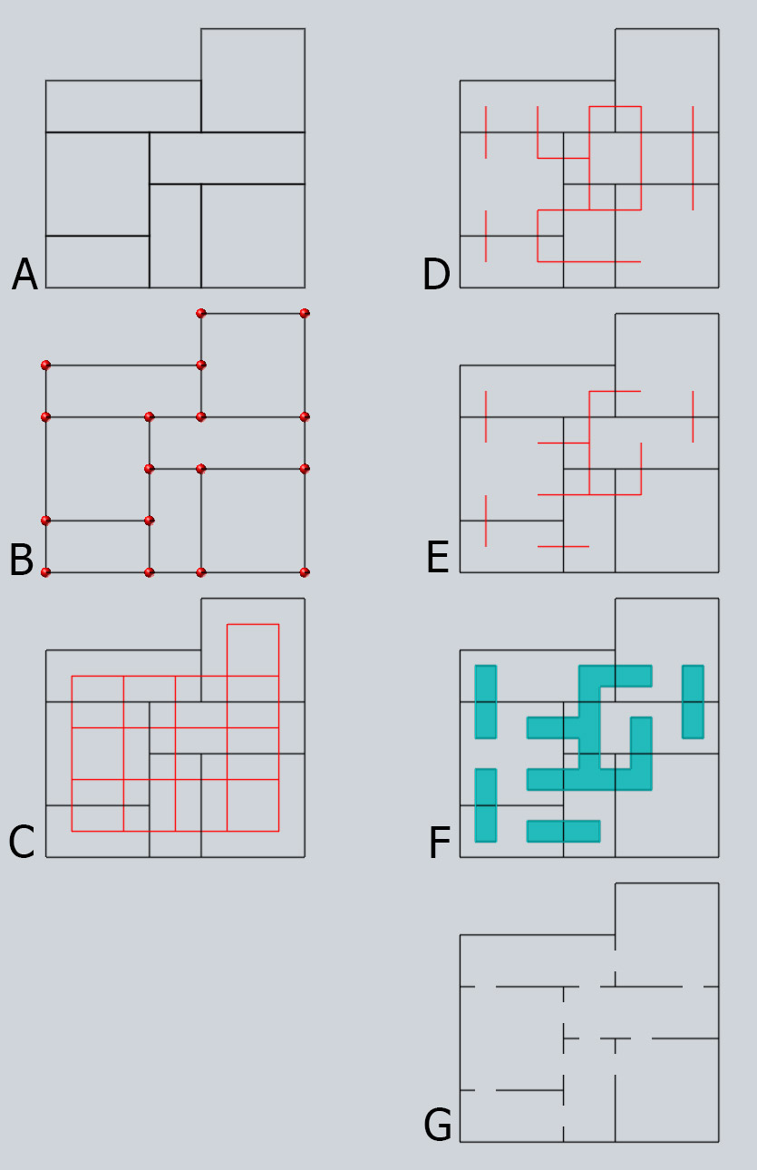 A) I create a collection of N rooms, integer sized (1-4 unit long, 2-4 unit large) and I uv-pack them together (uv layout). B) Boolean / convertline the result, so I have unique polyline primitives between all the points. C) I create this red inside polyline structures D) Intersectionanalysis between the red and the black lines, so I can delete every red lines that touch nothing … E) and also keep only one red primitive primitive, randomly, for every black wall line. F) polyexpand the red line G) boolean subtract with the black wall.