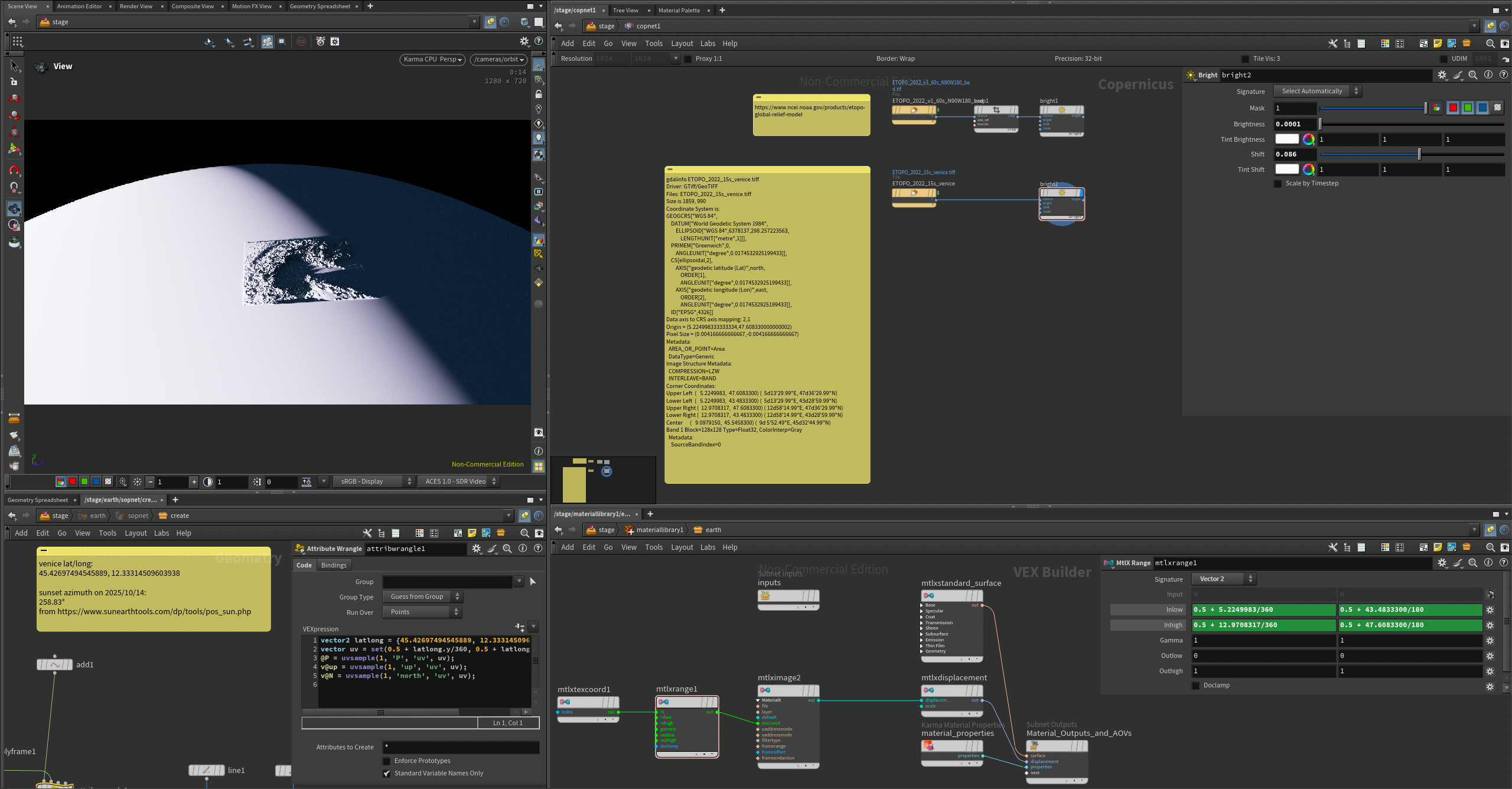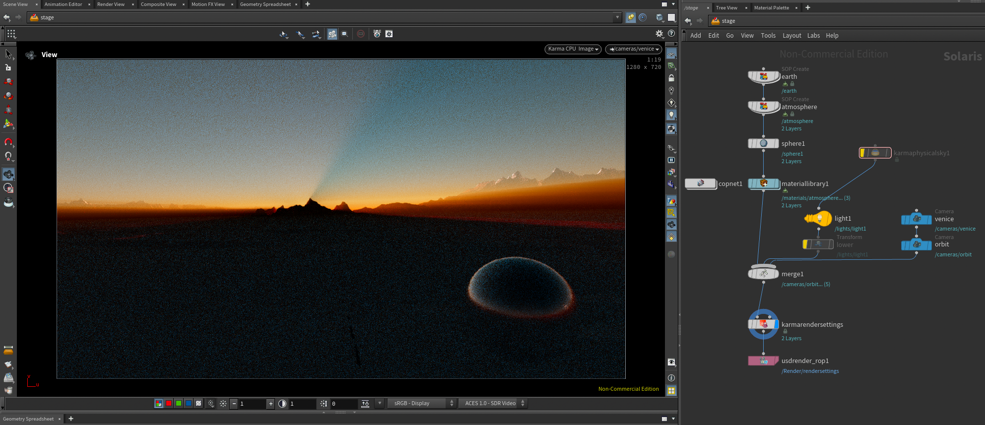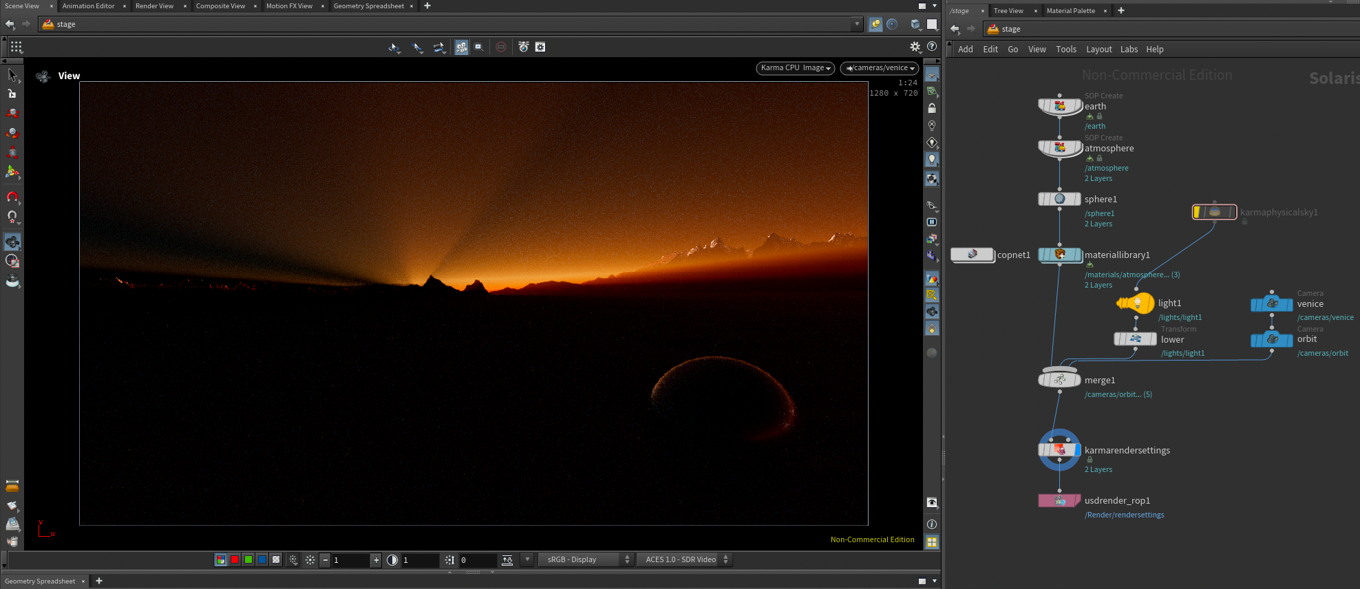 ok that pic flight took of the sunset shadow had been bugging me (discord.com/channels/270023348623376395/351983374510063636/1427701531674939523) so i did the obvious thing: downloaded an etopo DEM geotiff and used it to displace a scale model of the earth with a layer of uniform volume for the atmosphere, then looked up exactly which direction the sun set in on that day and put a sphere light over there 149 million km away 🌄 waddya know there are two mountains in just the right place and karma can kind of render a sunset even though it’s not spectral and doesn’t really have rayleigh scattering lobes