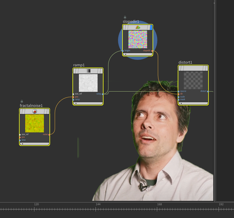 here is a neat little thing: if you make a random ramp and divide it with its average you can use it as a light gel filter and get white light that makes nice penumbras.